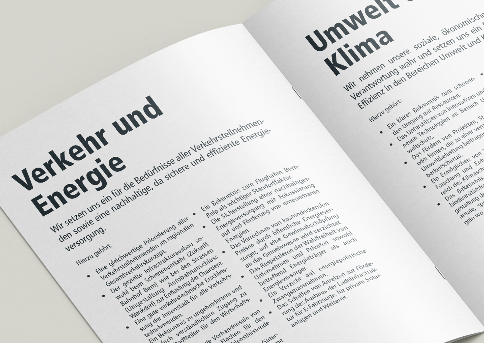 Im Auftrag der Daphinoff GmbH durften wir die Broschüre «Bern braucht Zukunft» konzipieren und realisieren. Sie informiert kompakt und anschaulich über das Programm und die Ziele der Vereinigung von fünf Berner Wirtschaftsverbänden (Handels- und Industrieverein des Kantons Bern, KMU Stadt Bern, Bern City, Hauseigentümerverband Bern und Umgebung und Die Berner Arbeitgeber).