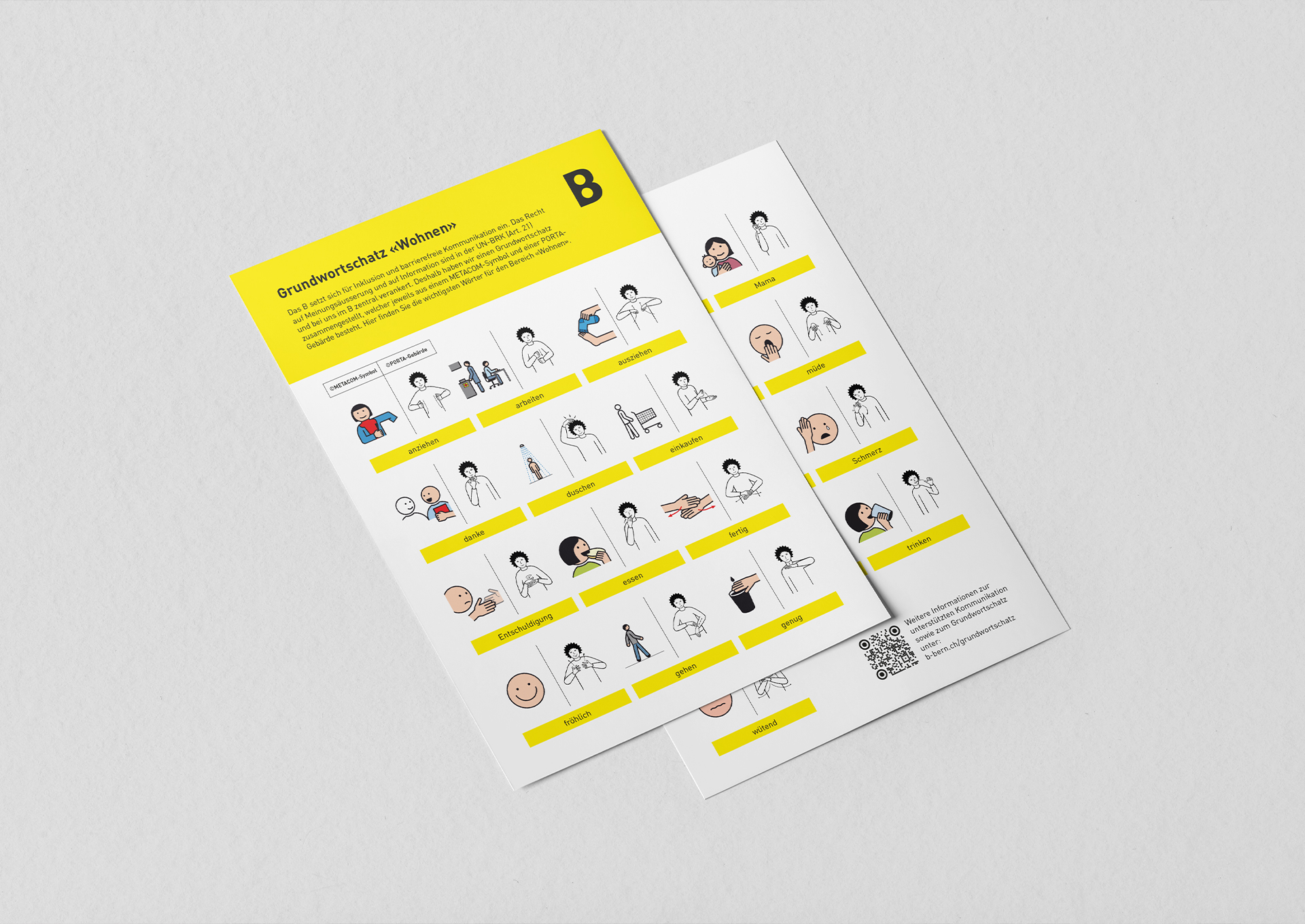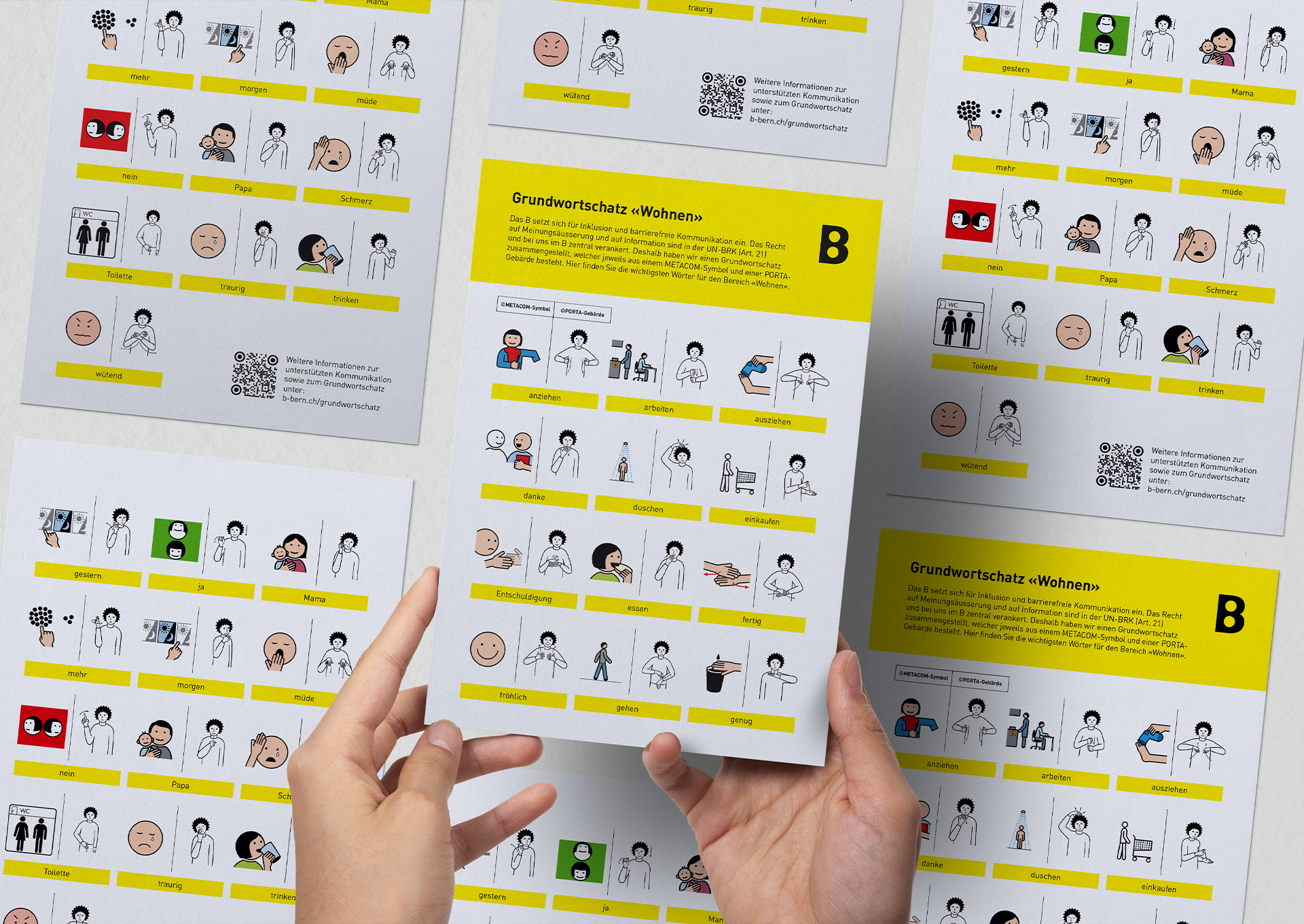 Das B setzt sich für Inklusion und barrierefreie Kommunikation ein. Gemeinsam mit dem B haben wir deshalb einen Grundwortschatz zusammengestellt, welcher jeweils aus einem Metacom-Symbol und einer PORTA-Gebärde besteht. Hier sind die wichtigsten Begriffe des Alltags zusammengefasst, welche alle Mitarbeitende kennen sollten.