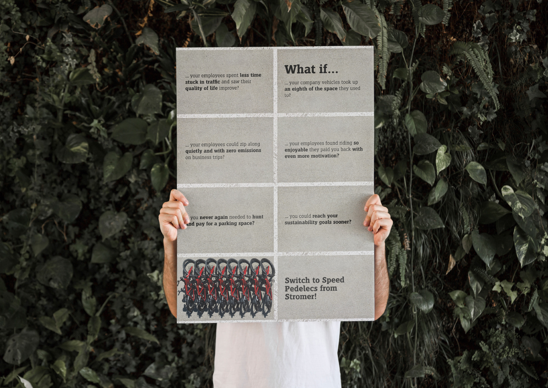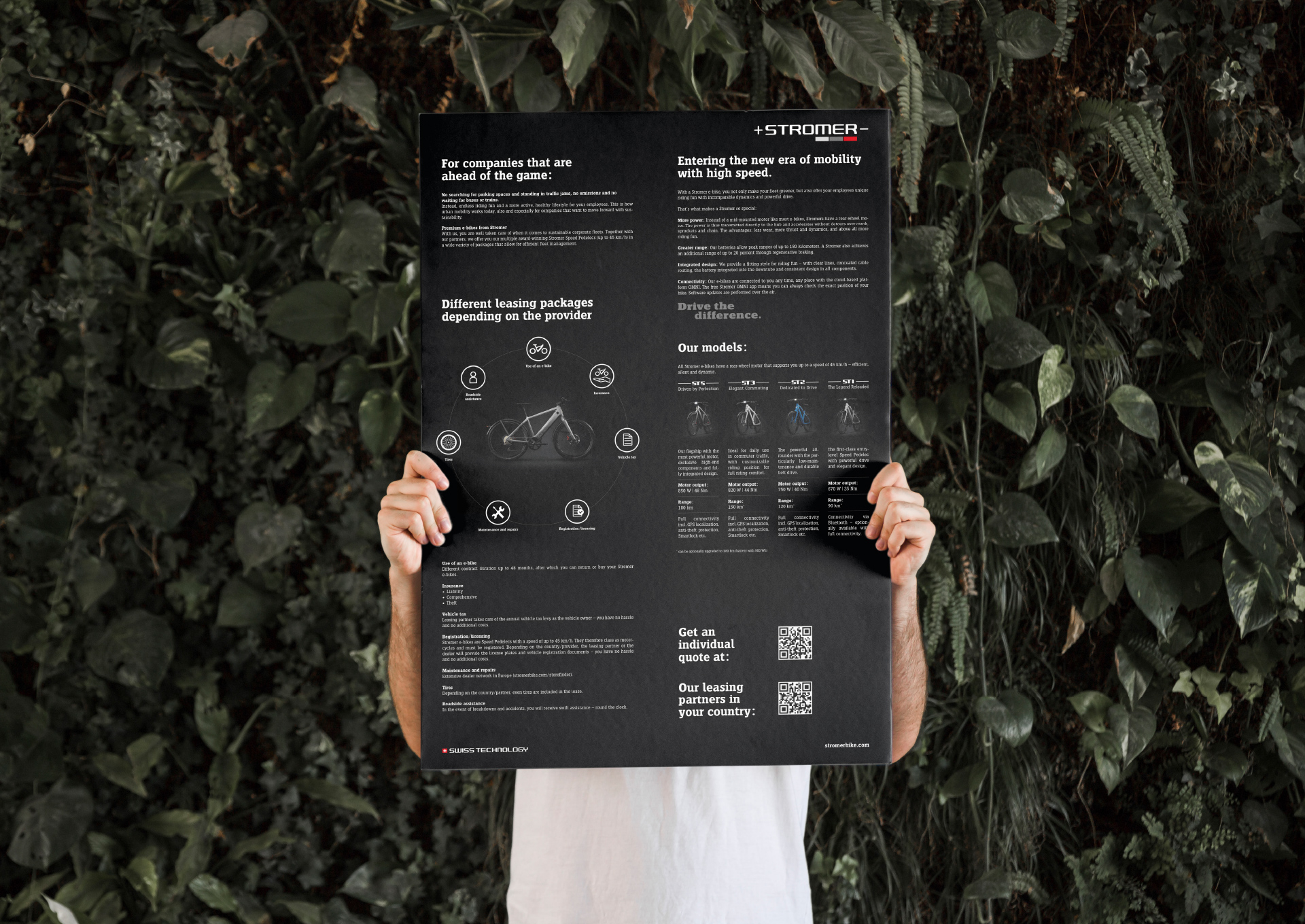 myStromer gehört zu den führenden Schweizer Speed-Pedelec-Marken – und zu unseren ersten Kunden. Für die Bewerbung ihres All-inclusive-Flottenangebots haben wir ein Geschäftskunden-Mailing kreiert, das die Vorteile eines E-Bikes gegenüber dem Auto auf den Punkt oder: auf den Parkplatz bringt; kein Parkierstress, keine Abgase, mehr Bewegung, mehr Spass.