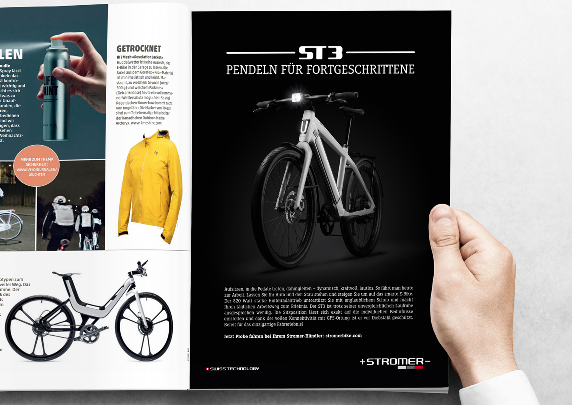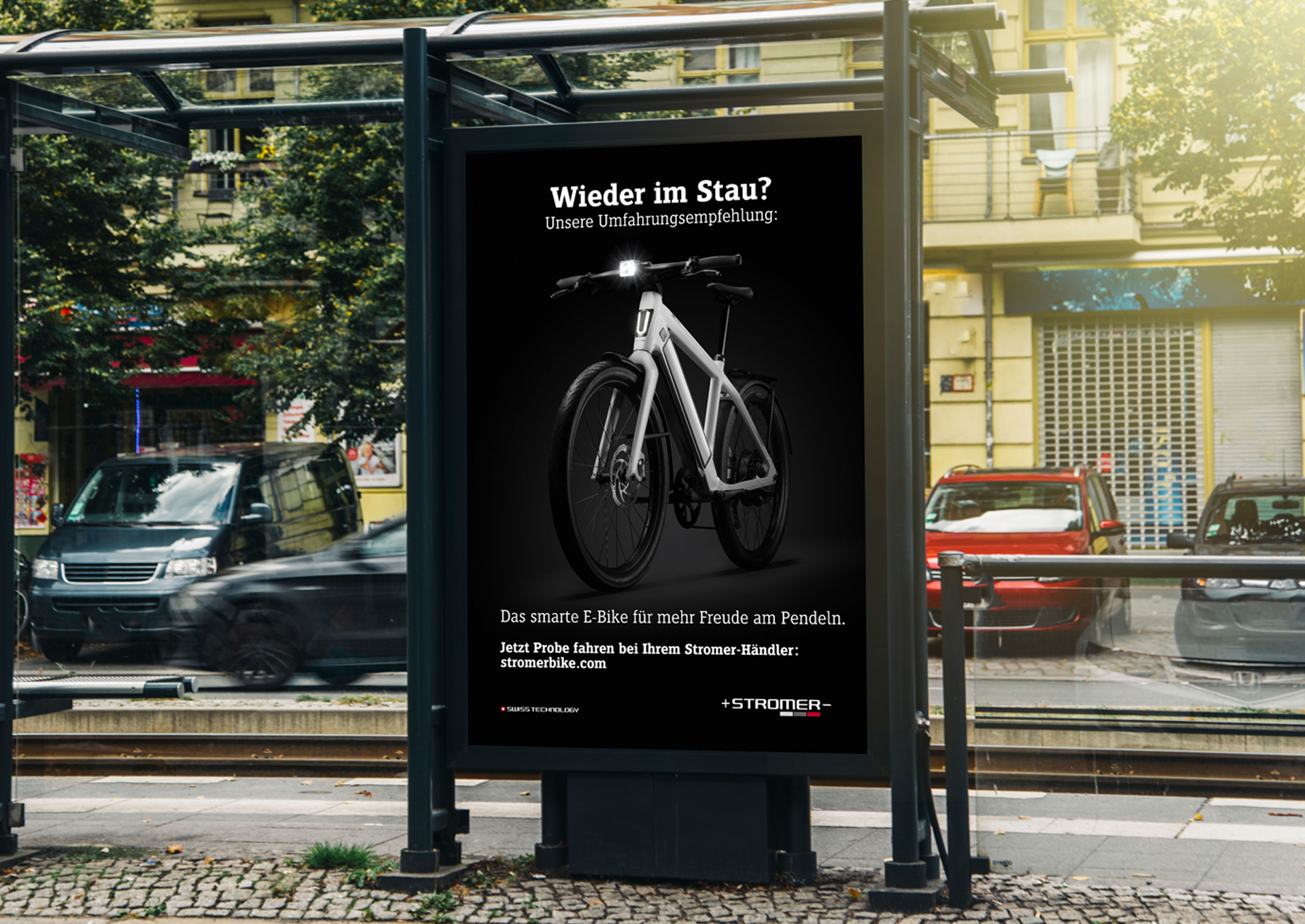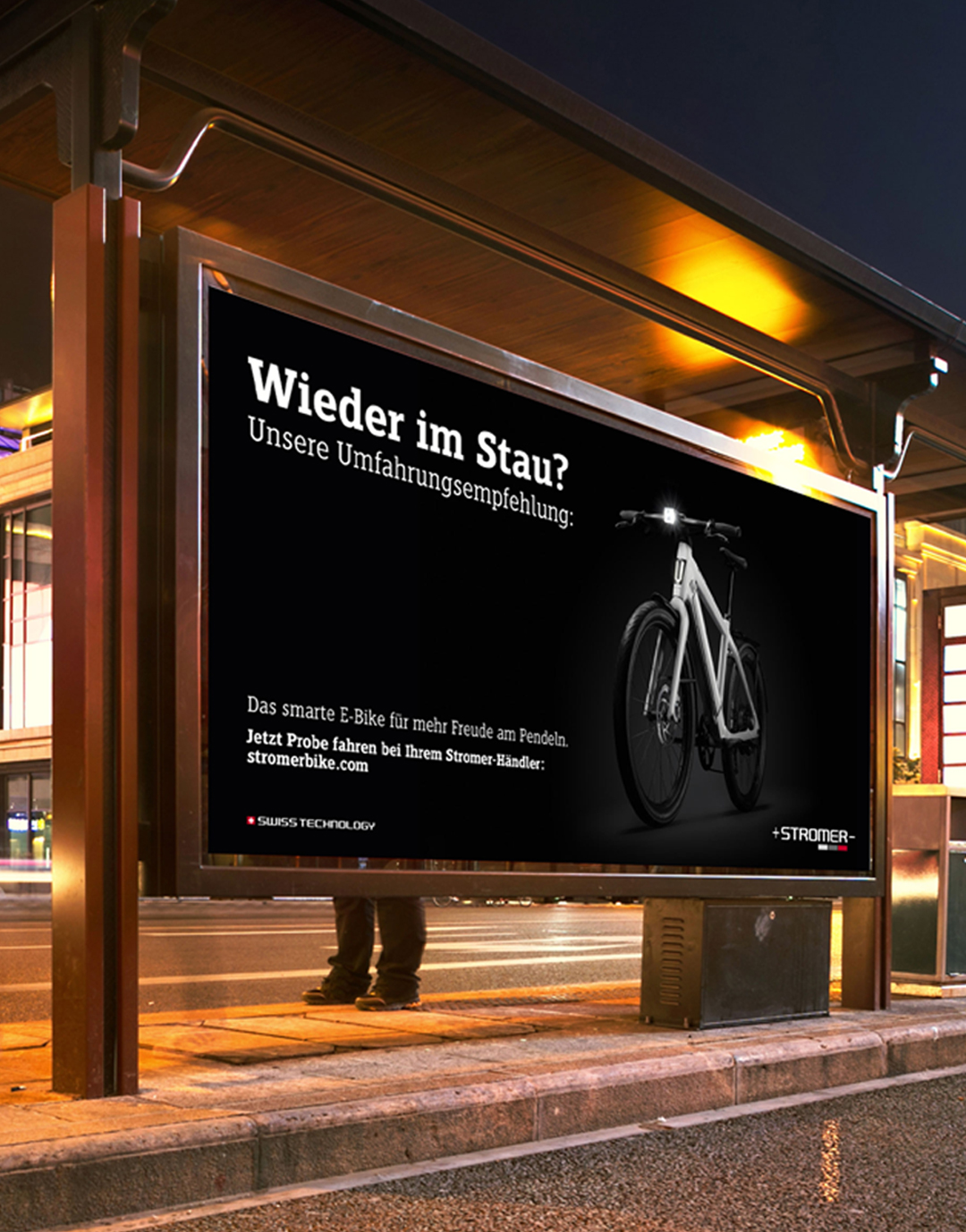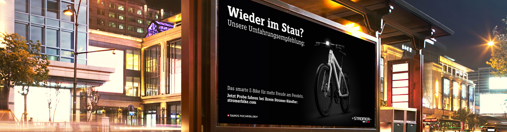myStromer gehört zu den führenden Schweizer Speed-Pedelec-Marken – und zu unseren ersten Kunden. Für ihre Kampagne «Gut gegen Stau» haben wir Inserate, Plakate, POS- und Eventbanner sowie Online Ads mit dramatischen Produktinszenierungen und klaren Headlines kreiert.