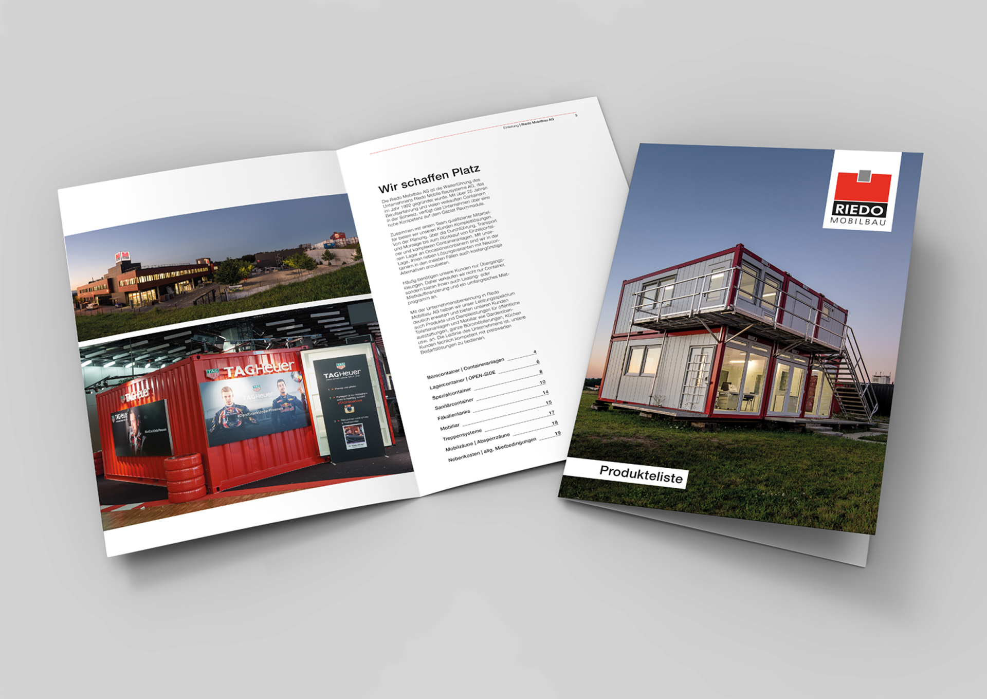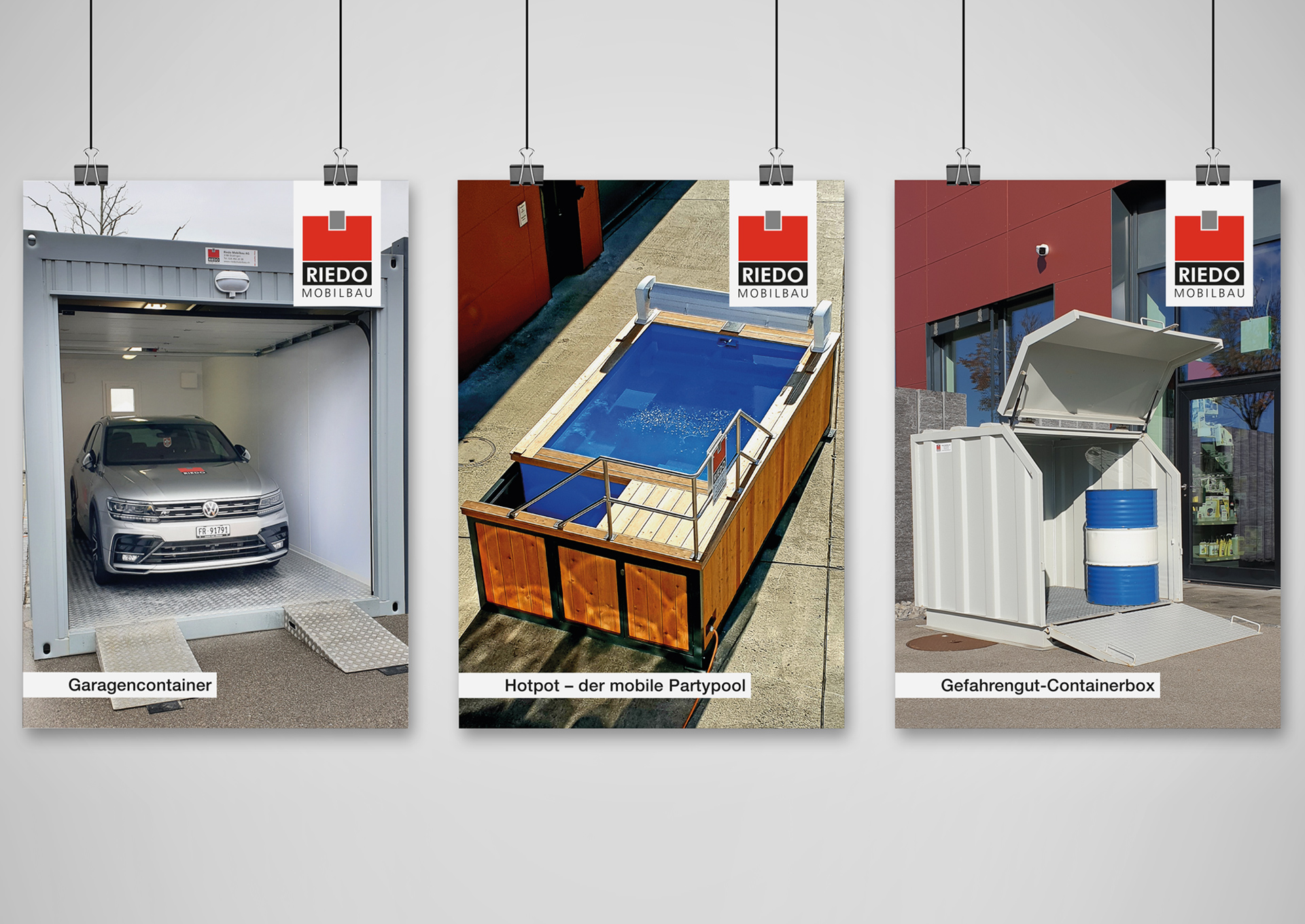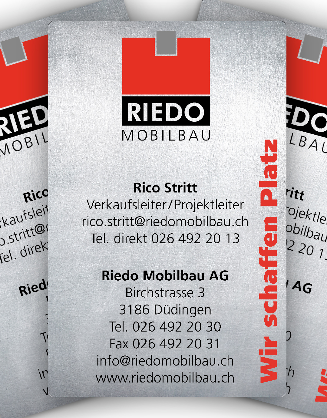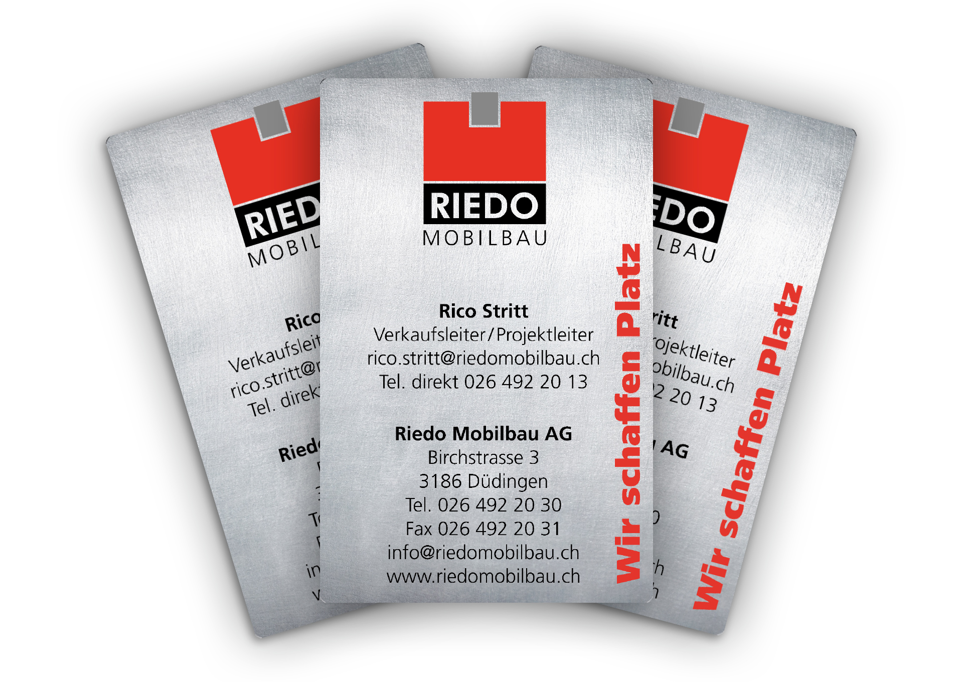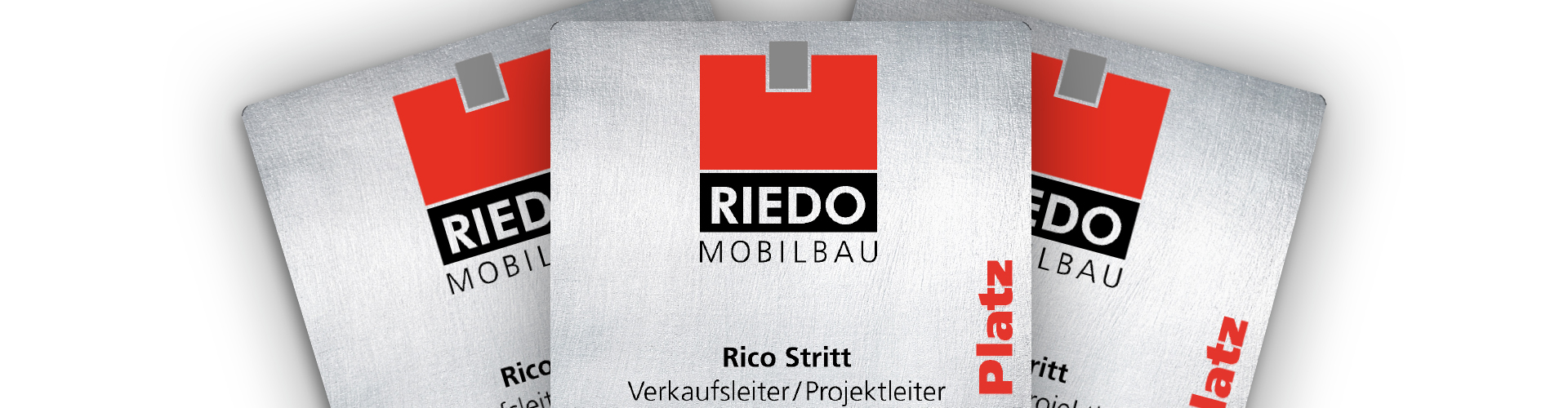 Für Riedo Mobilbau in Düdingen haben wir diverse Produkteflyer und Visitenkarten aus Metall kreiert.