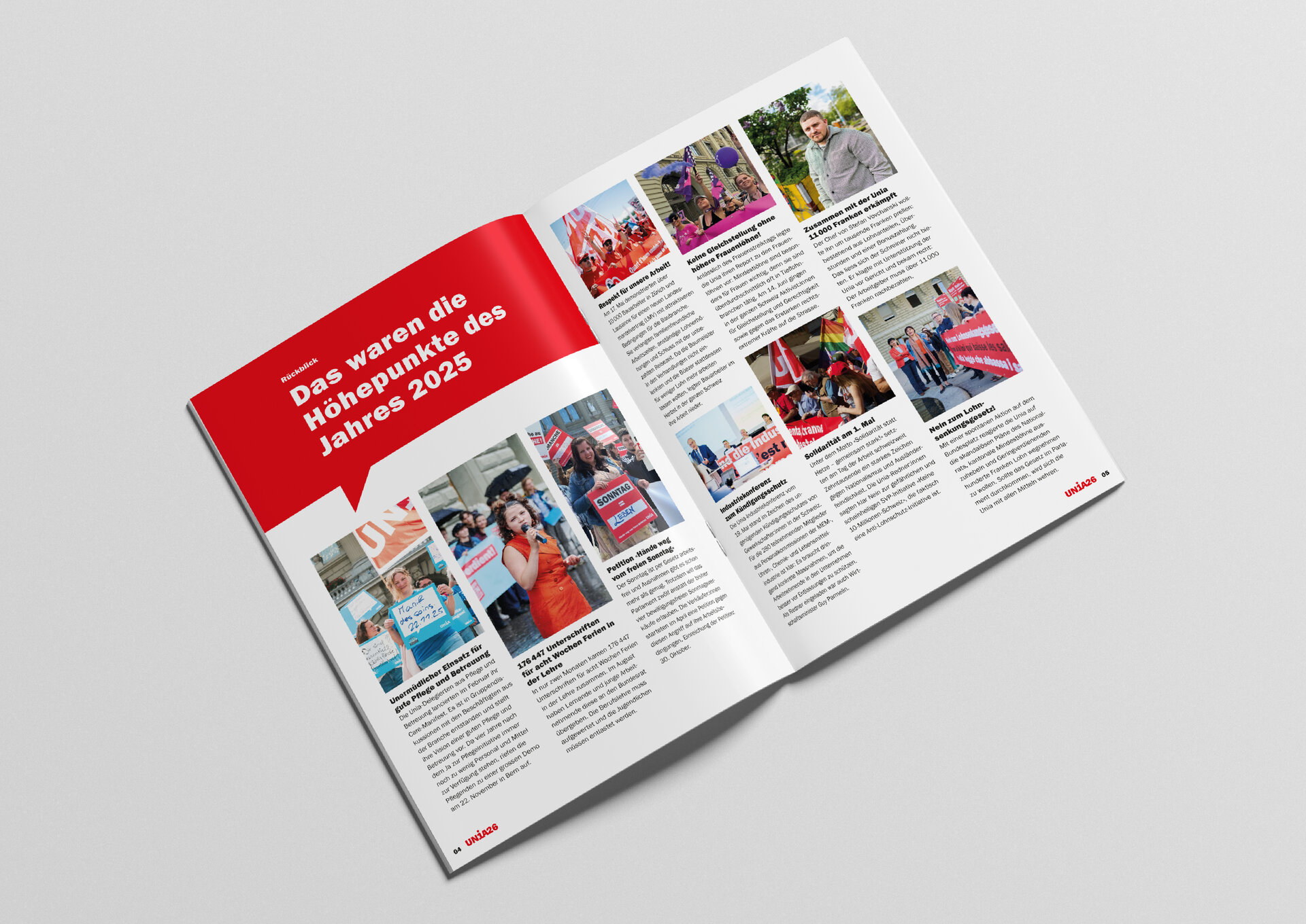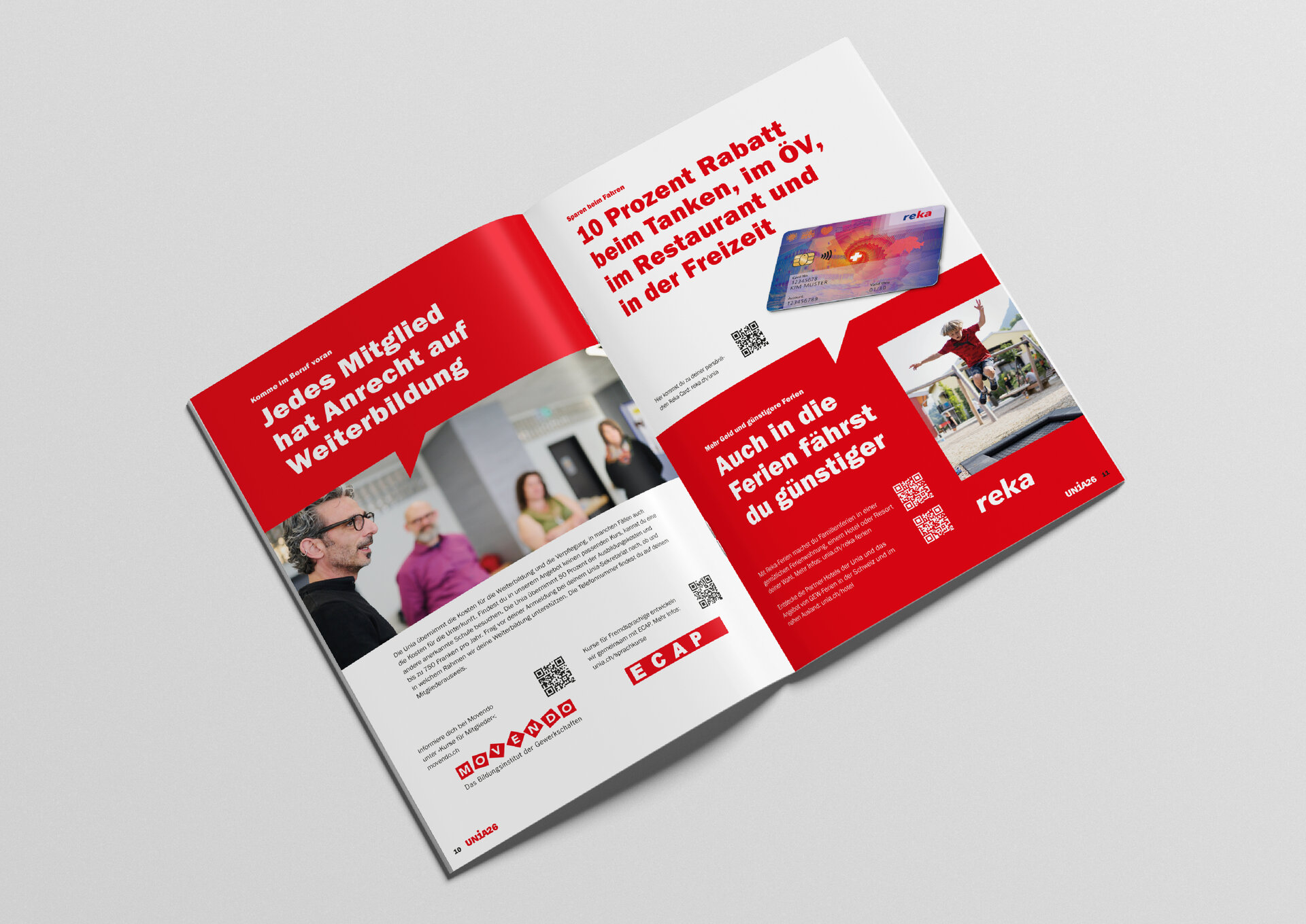 Das Ergebnis ist eine klare, zeitgemässe Publikation, die künftig jährlich erscheint und die Inhalte der Gewerkschaft visuell prägnant und zugänglich vermittelt.