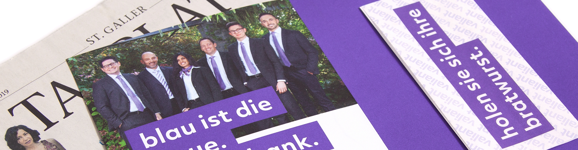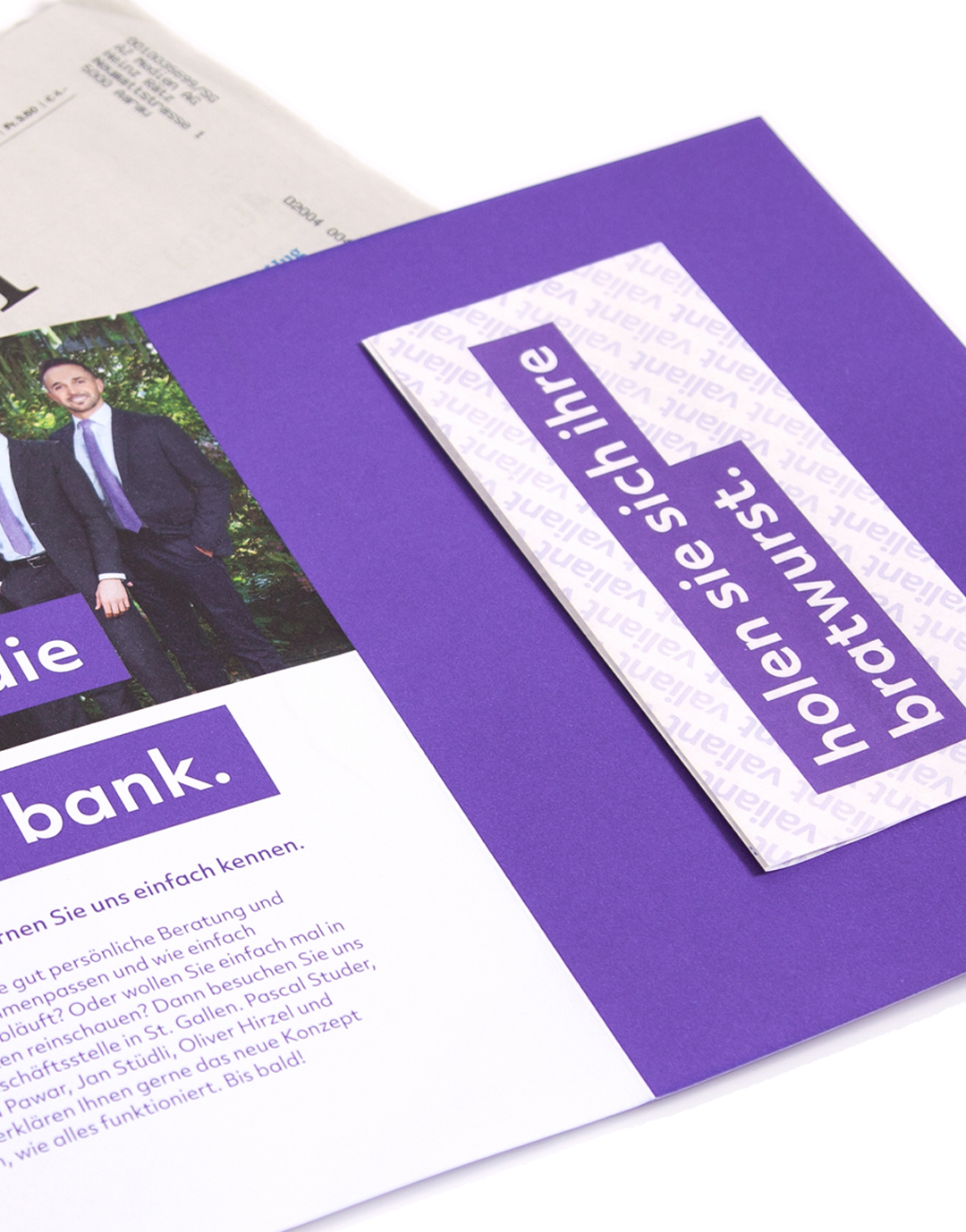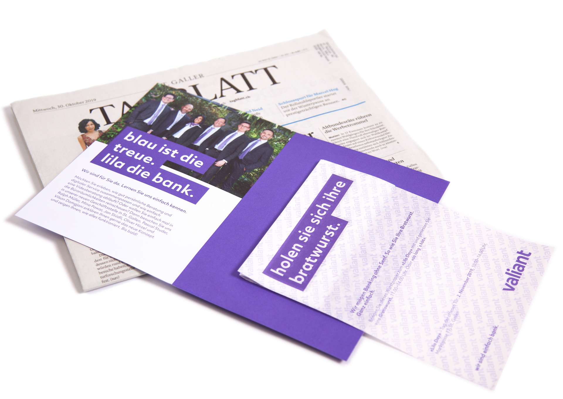2019 eröffnete die Valiant ihre ersten Ostschweizer Filialen in St. Gallen und Wil. Mit dem von uns gestalteten Mailing wurde die Eröffnung der neuen Standorte und der damit verbundene Tag der offenen Türen beworben. Als Beilage für das St. Galler Tagblatt kreierten wir zudem einen Flyer mit einem für St. Gallen typischen Bratwurstpapier. Bei Abgabe dieses Wurstpapieres am Tag der offenen Tür gab es eine Gratisbratwurst.