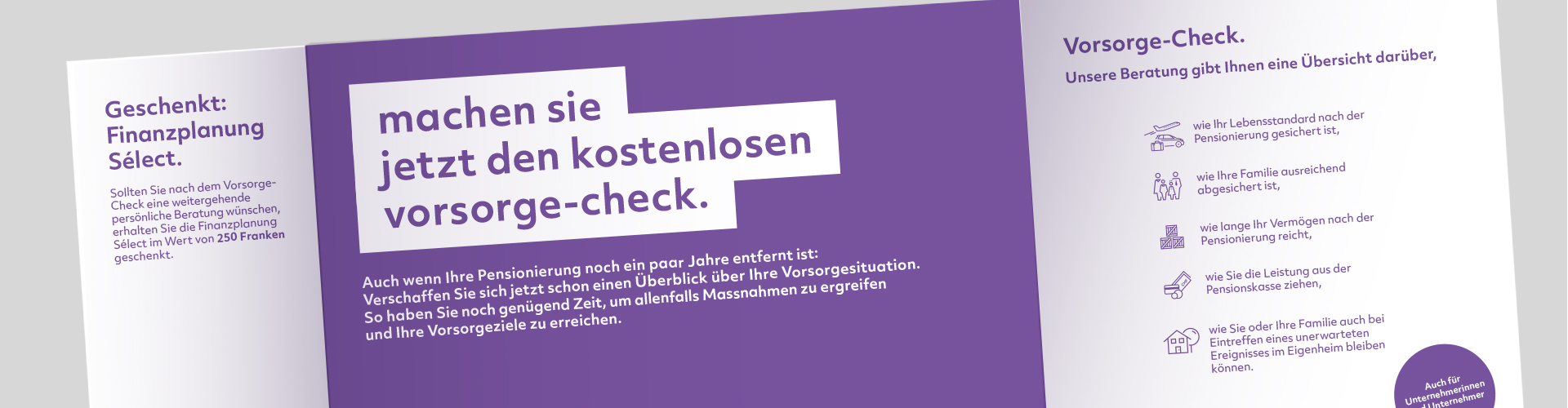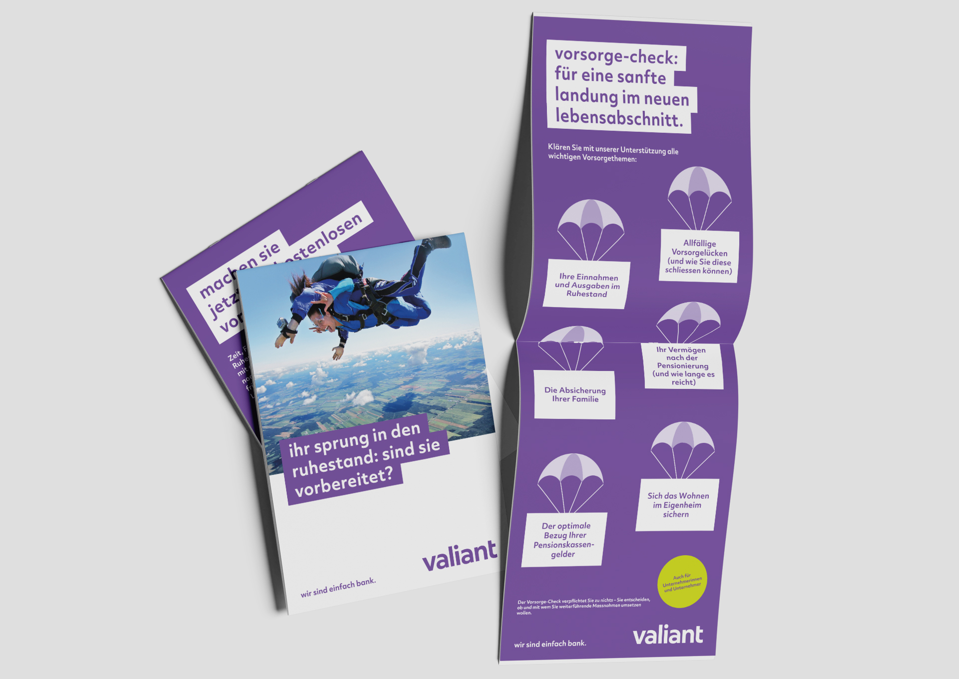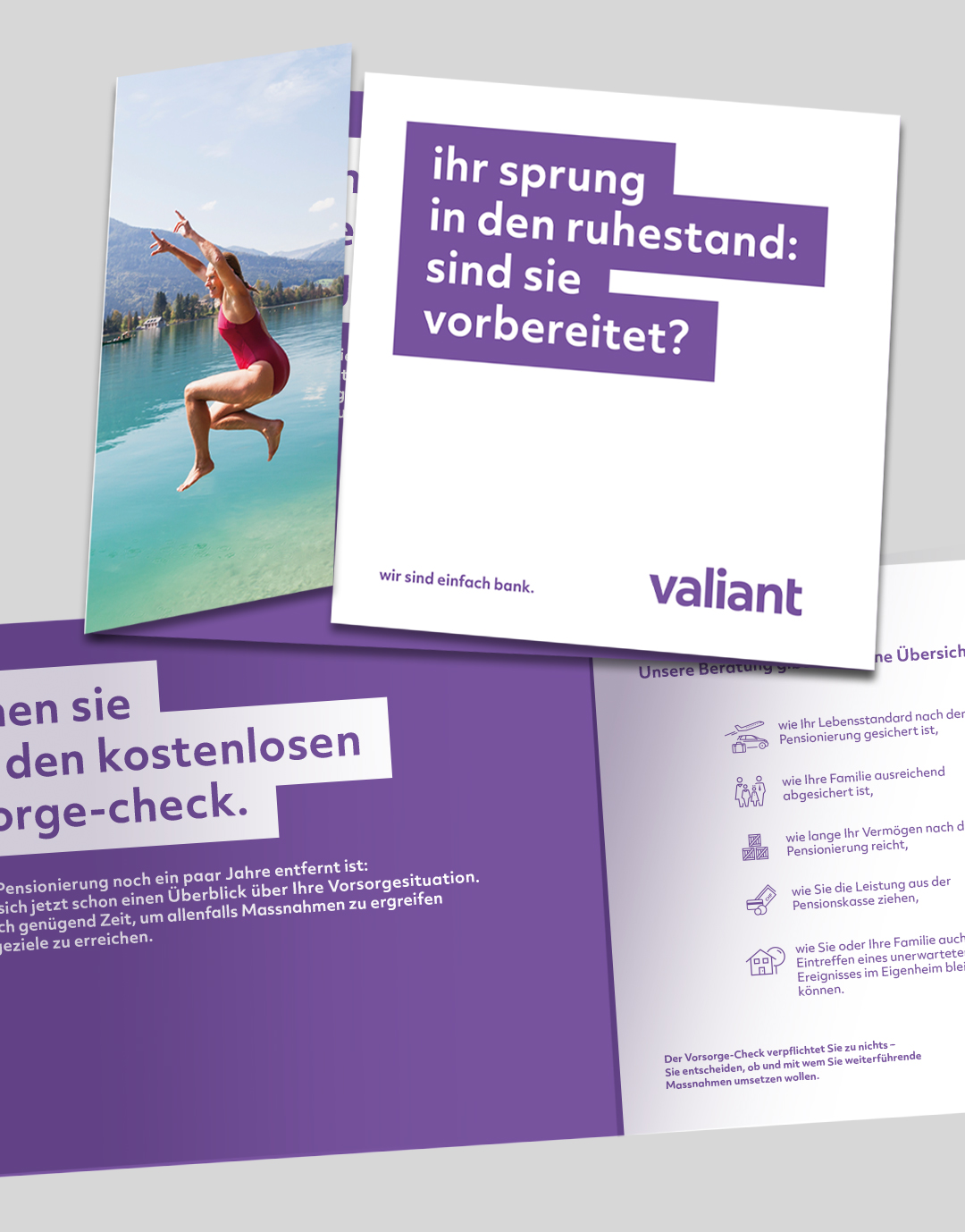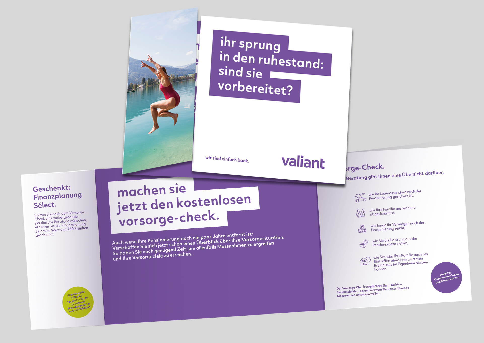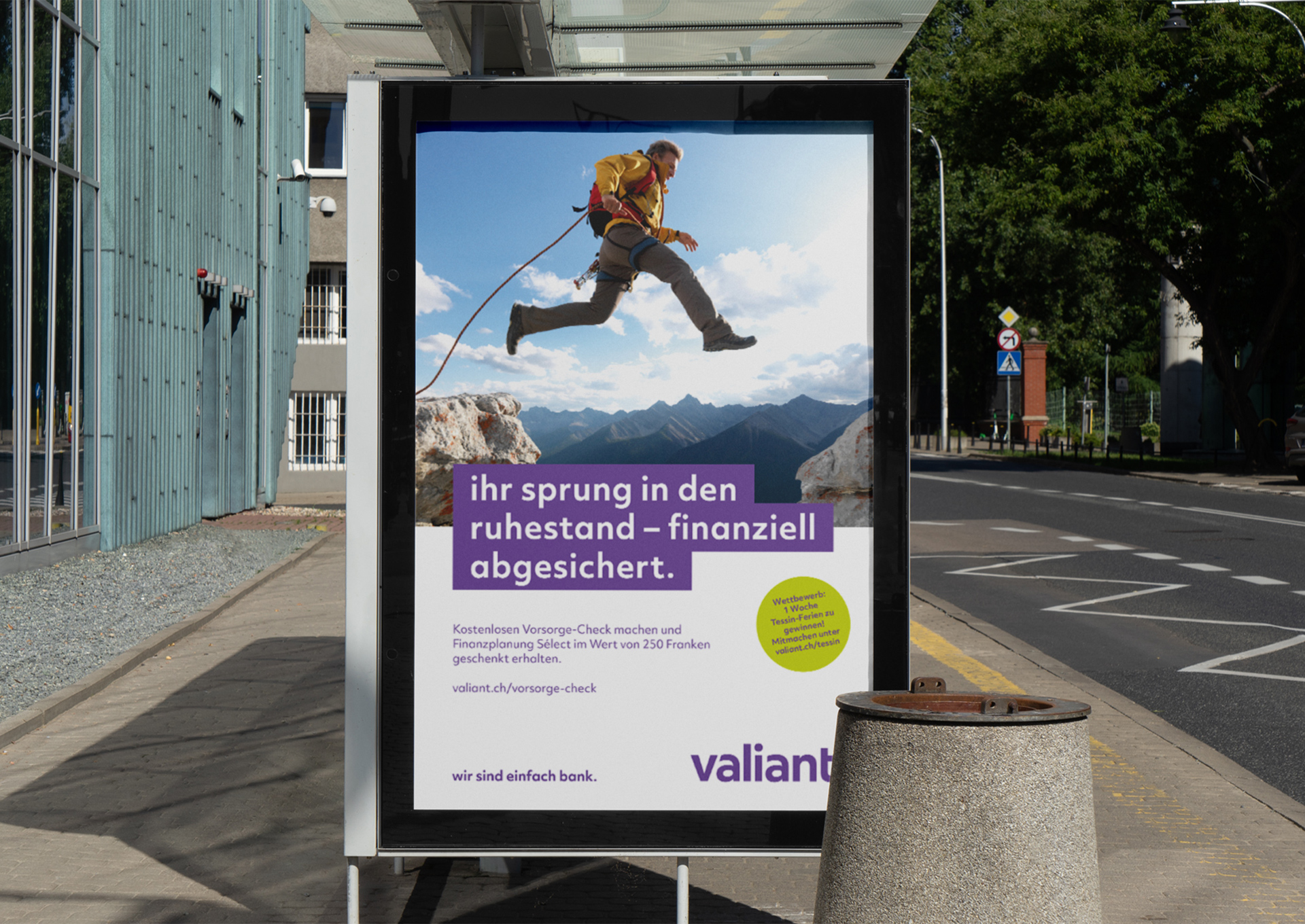 Mit dem Vorsorge-Check von Valiant können sich Pensionär:innen dereinst finanziell abgesichert und voller Freude in den Ruhestand stürzen. Das war die Botschaft einer breit angelegten Kampagne für eine frühzeitige Vorbereitung auf die Pensionierung. Idee und Umsetzung für Plakate, Inserate, DOOH und ein 3-stufiges Direct Mailing mit verschiedenen Sujets stammte von uns.